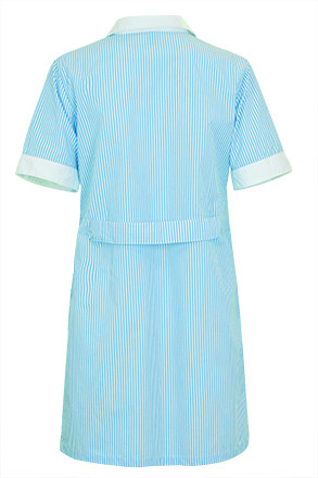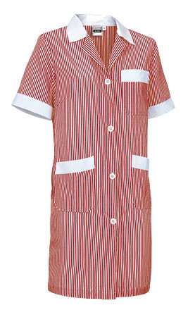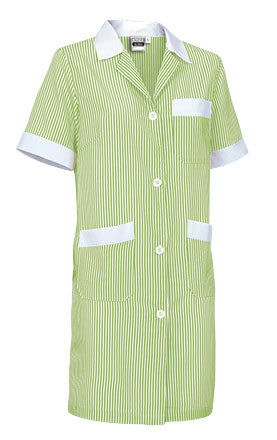 Bata laboral de manga corta y corte entallado con pinzas, confeccionada en tejido mil rayas bicolor a la plana, cómodo y resistente.