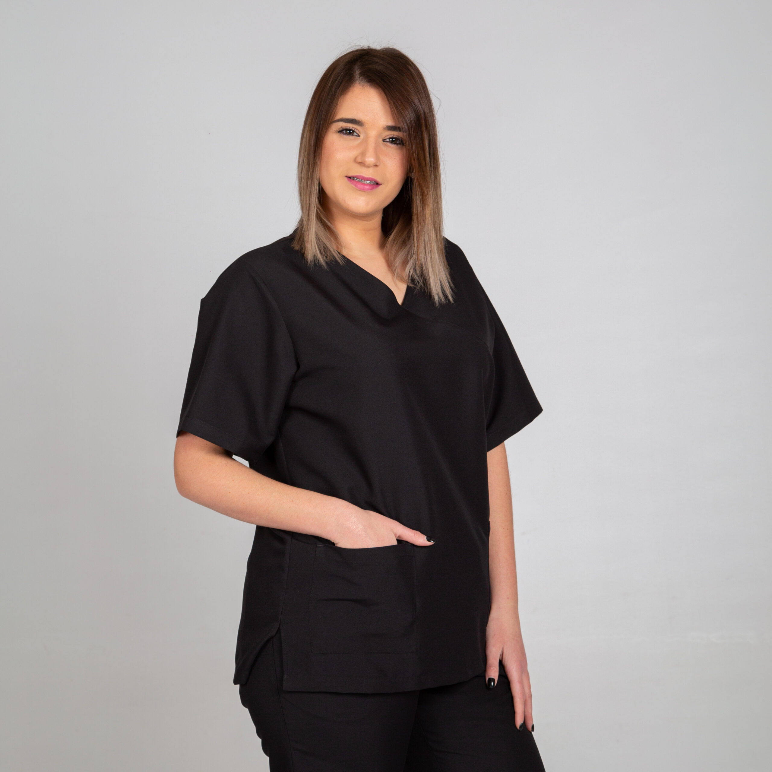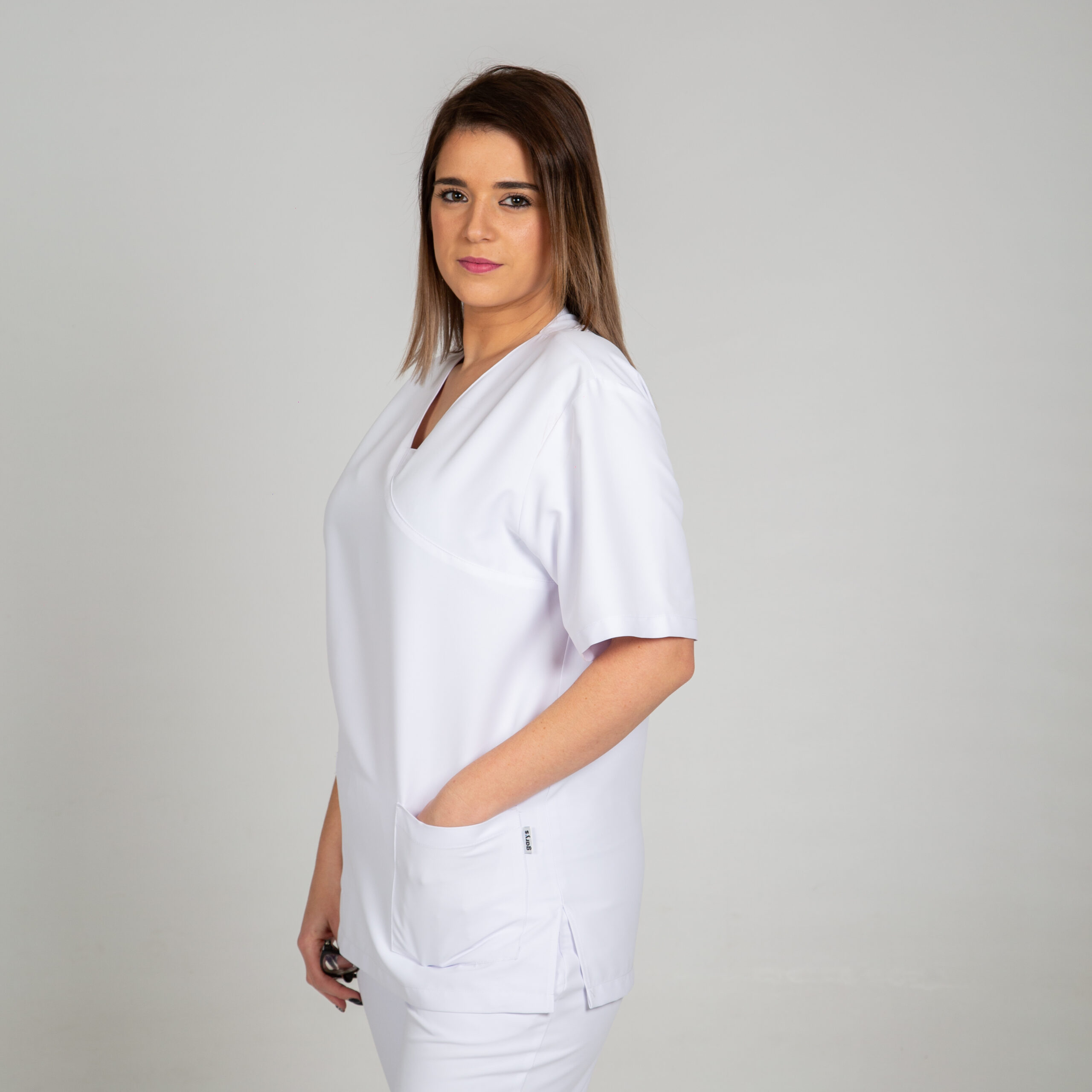 El modelo semi ajustado, con aberturas laterales, asegura comodidad durante largas jornadas laborales. Ideal como uniforme para profesionales de la salud, incluyendo enfermería, doctores, y para diversos entornos como hospitales, clínicas, farmacias o veterinarios.