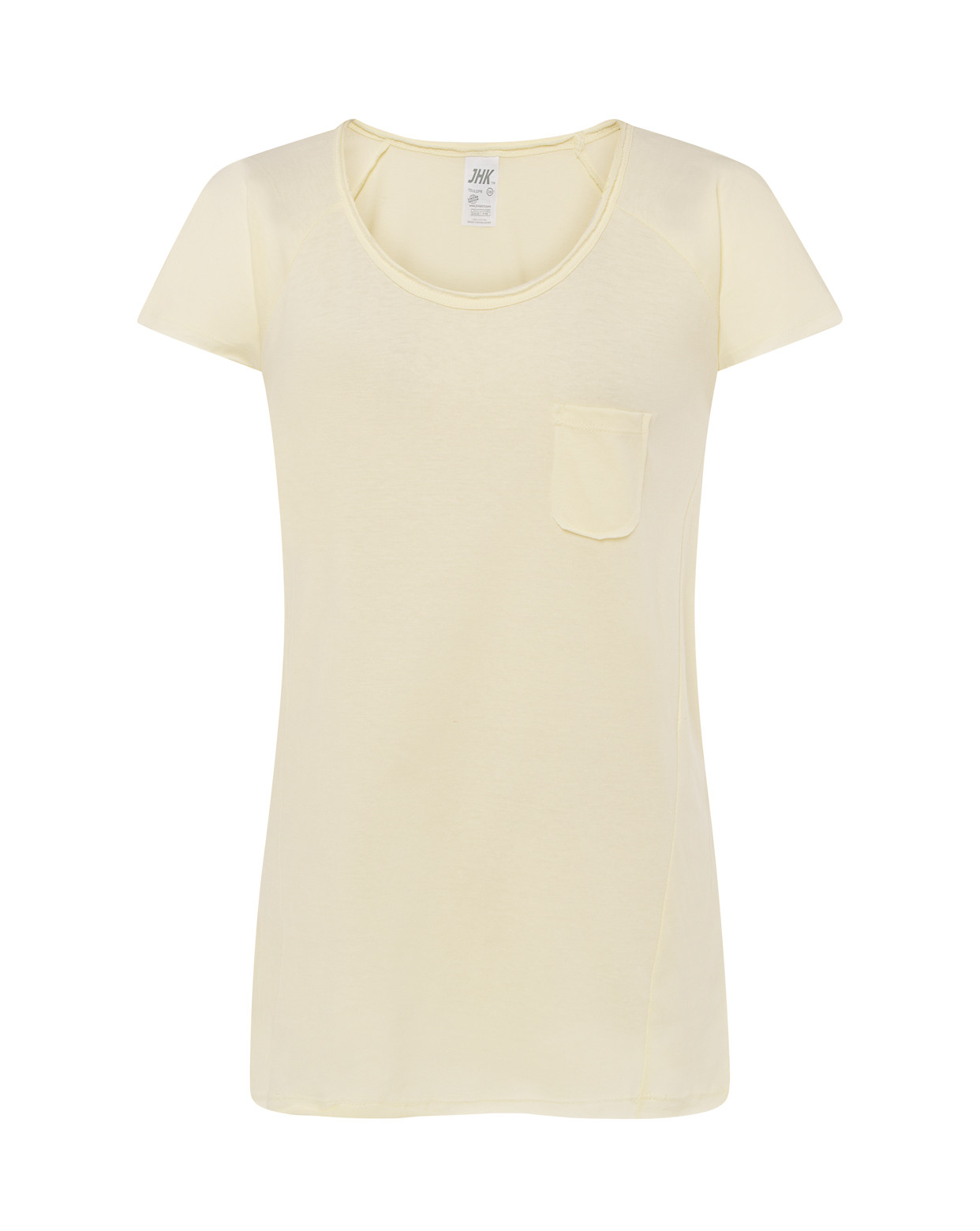 Camiseta de mujer con bolsillo delantero y cuello redondo abierto, 100% algodón.