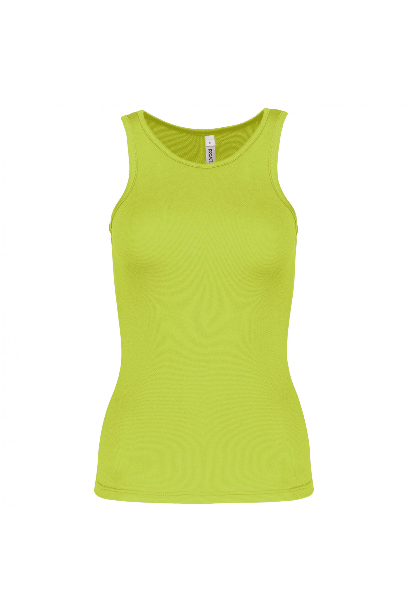 100% poliéster. Tejido ligero de secado rápido. Espalda estilo nadadora. Biés en cuello y sisas. Acabado con doble pespunte en el bajo de la prenda. Certificado STANDARD 100 by OEKO-TEX® N° CQ 1007/7, IFTH.