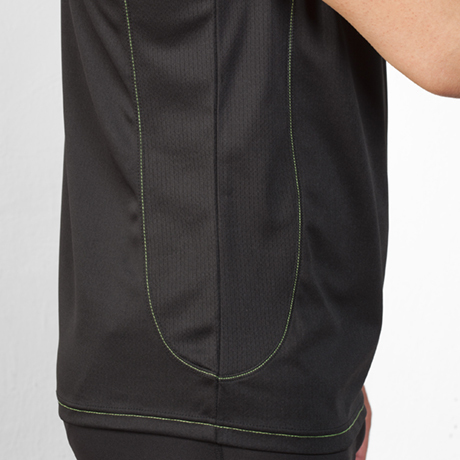 Cuello viveado con el mismo tejido. Tejido transpirable de fácil lavado y secado.
