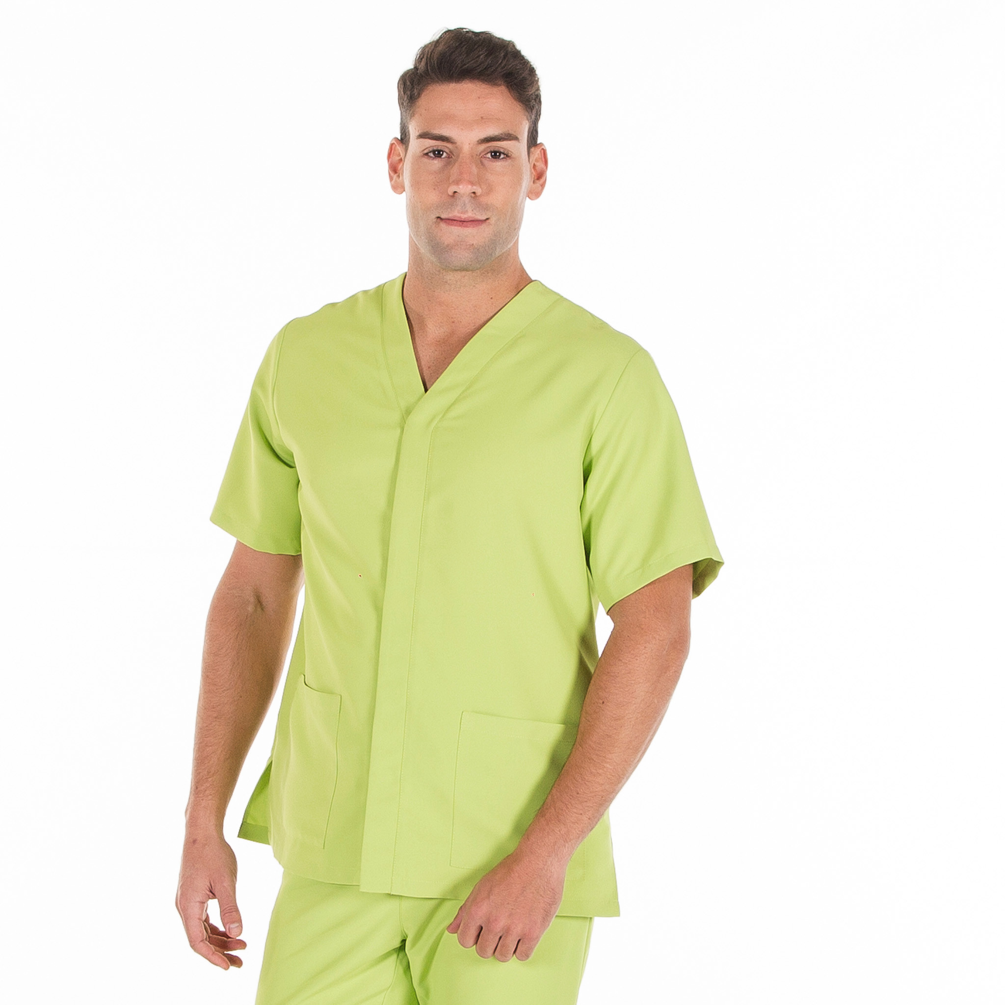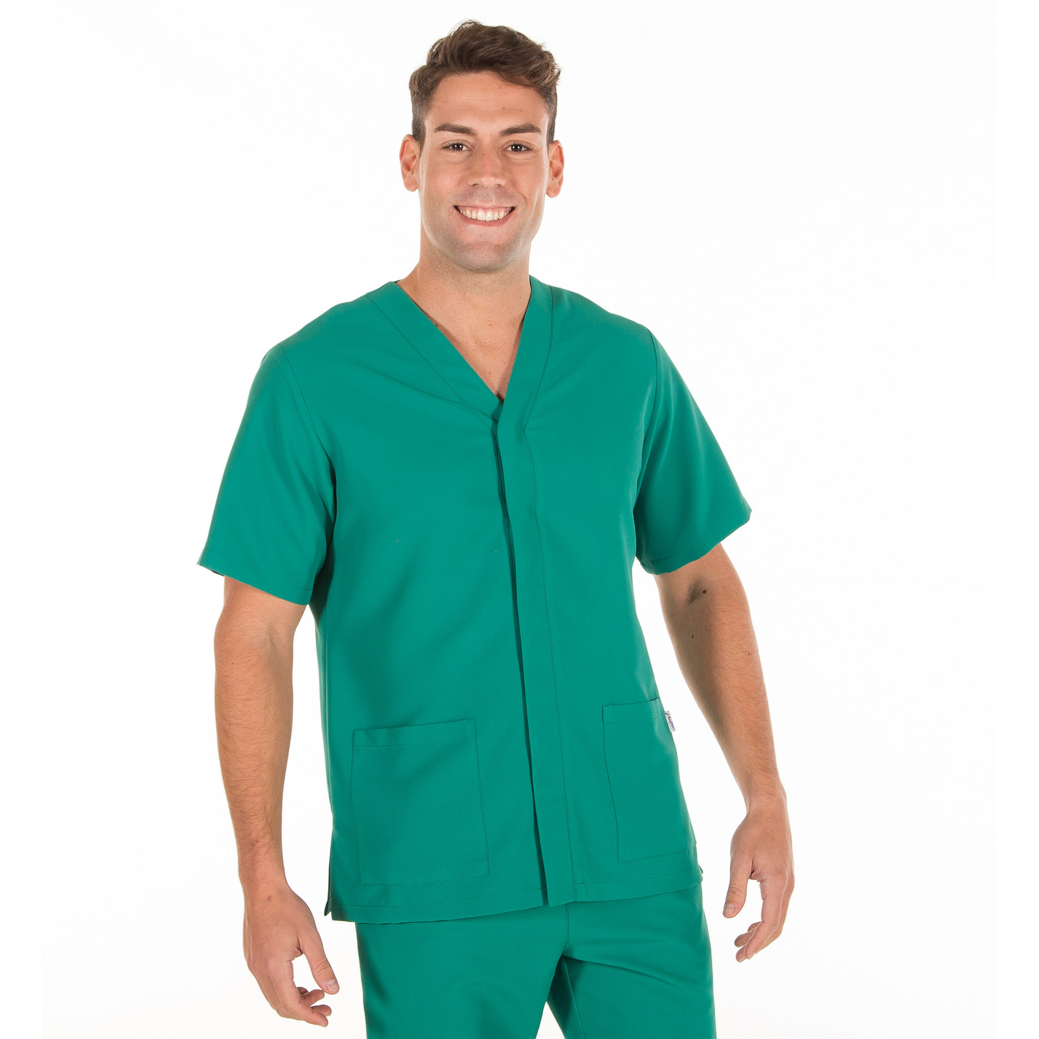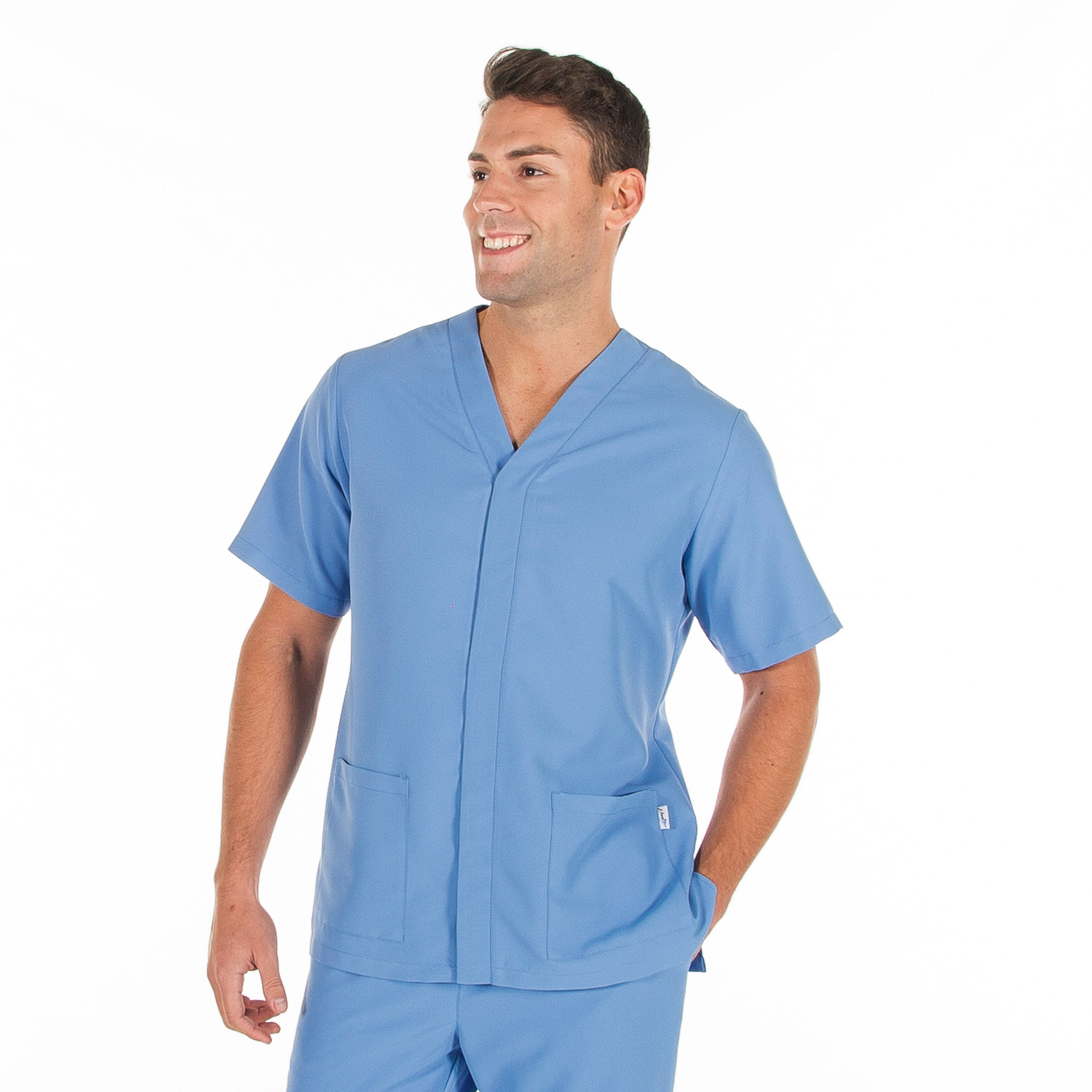 Casaca para hombre en manga corta, con cuello pico, cierre mediante botones de presión ocultos y dos bolsillos de parche delanteros. Prenda semi ajustada, con pinzas en la espalda y aberturas laterales. Confeccionada en MICROFIBRA de 100% Poliéster, un tejido antibacterias, altamente transpirable, tolerante a salpicaduras de lejía, lavable a 90º, con un rápido secado, sin necesidad de planchado y repelente al cabello y pelo de mascotas. Ideal para uniformes de enfermería, doctores y demás profesionales sanitarios en hospitales, clínicas y centros médicos, farmacia, laboratorio, veterinario, estética, spa o comercio.