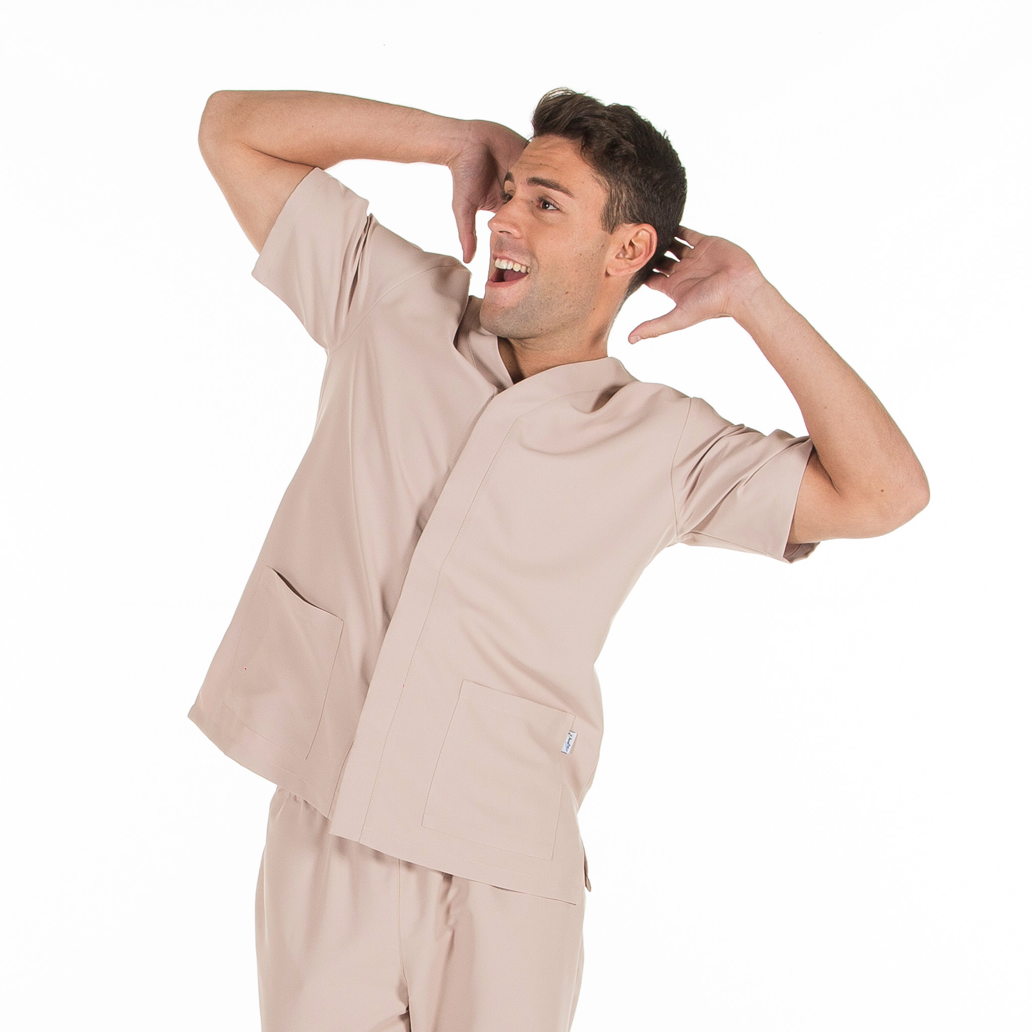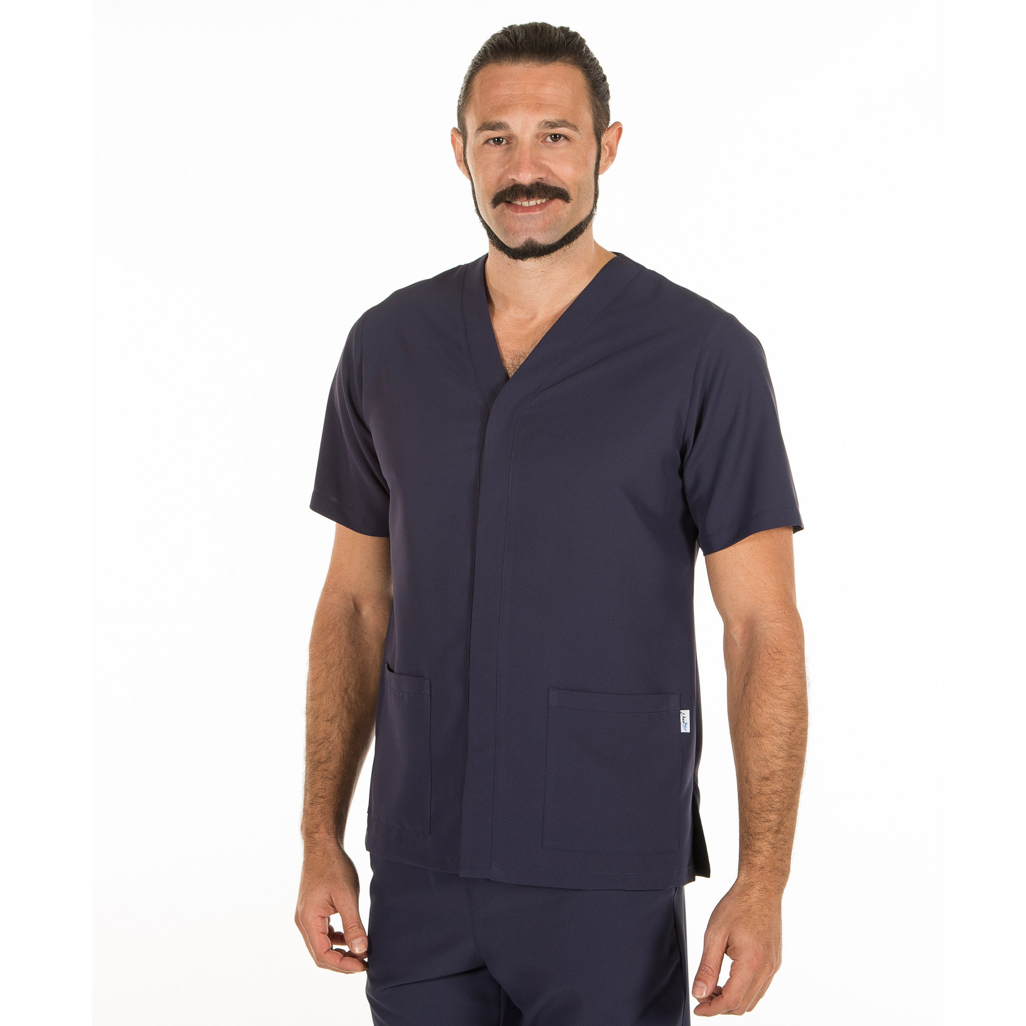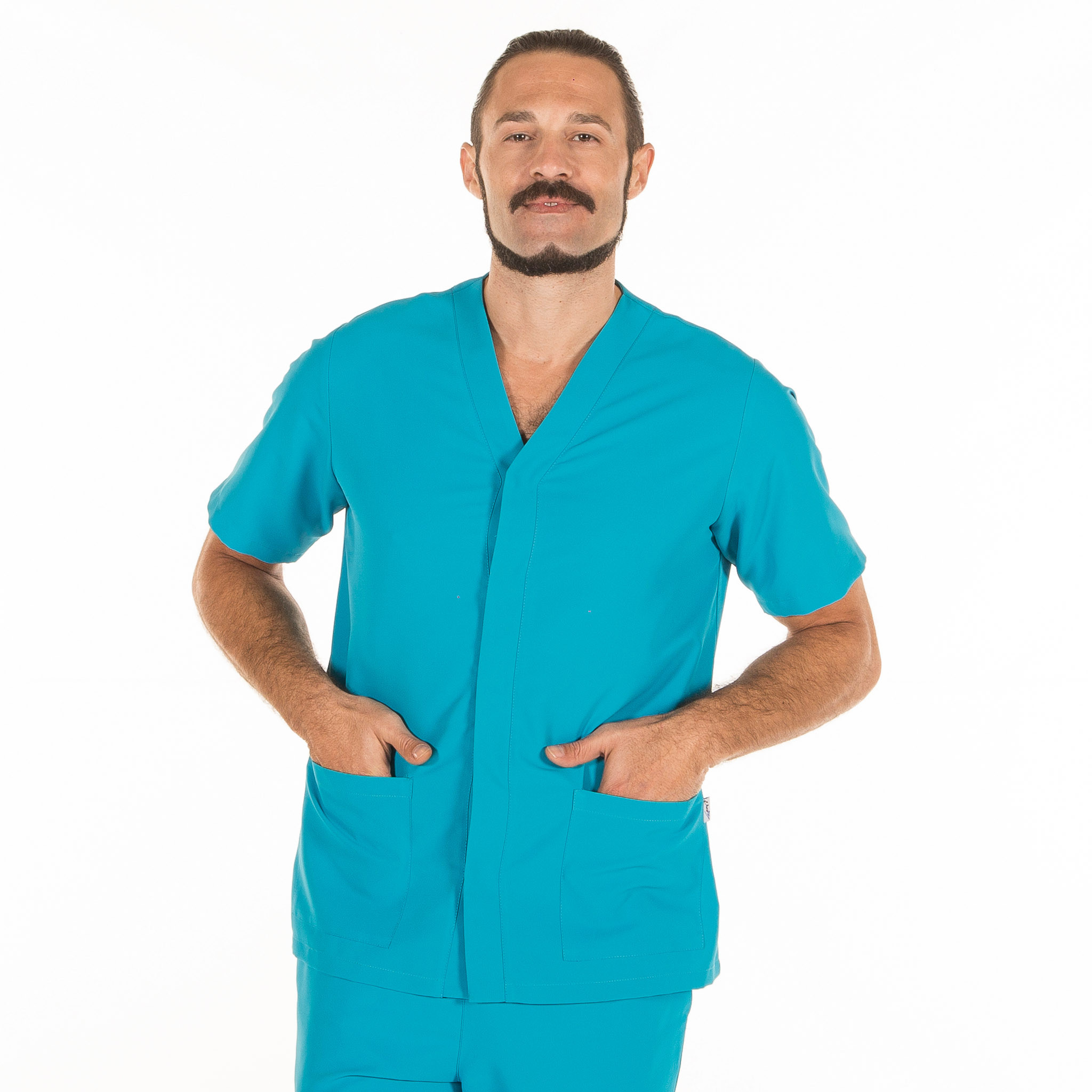 Casaca para hombre en manga corta, con cuello pico, cierre mediante botones de presión ocultos y dos bolsillos de parche delanteros. Prenda semi ajustada, con pinzas en la espalda y aberturas laterales. Confeccionada en MICROFIBRA de 100% Poliéster, un tejido antibacterias, altamente transpirable, tolerante a salpicaduras de lejía, lavable a 90º, con un rápido secado, sin necesidad de planchado y repelente al cabello y pelo de mascotas. Ideal para uniformes de enfermería, doctores y demás profesionales sanitarios en hospitales, clínicas y centros médicos, farmacia, laboratorio, veterinario, estética, spa o comercio.