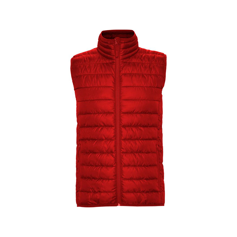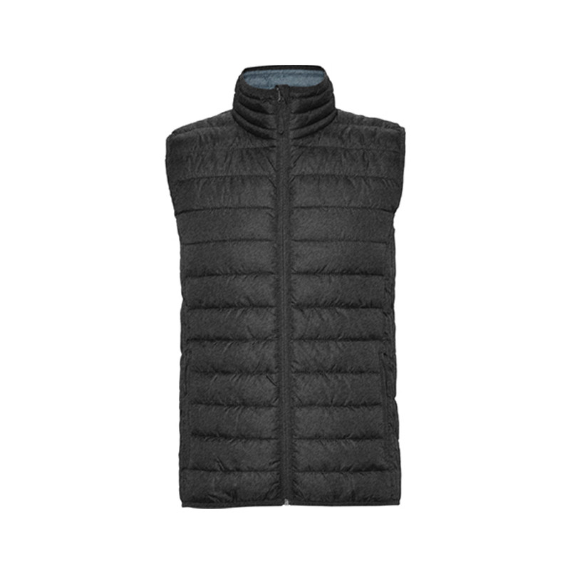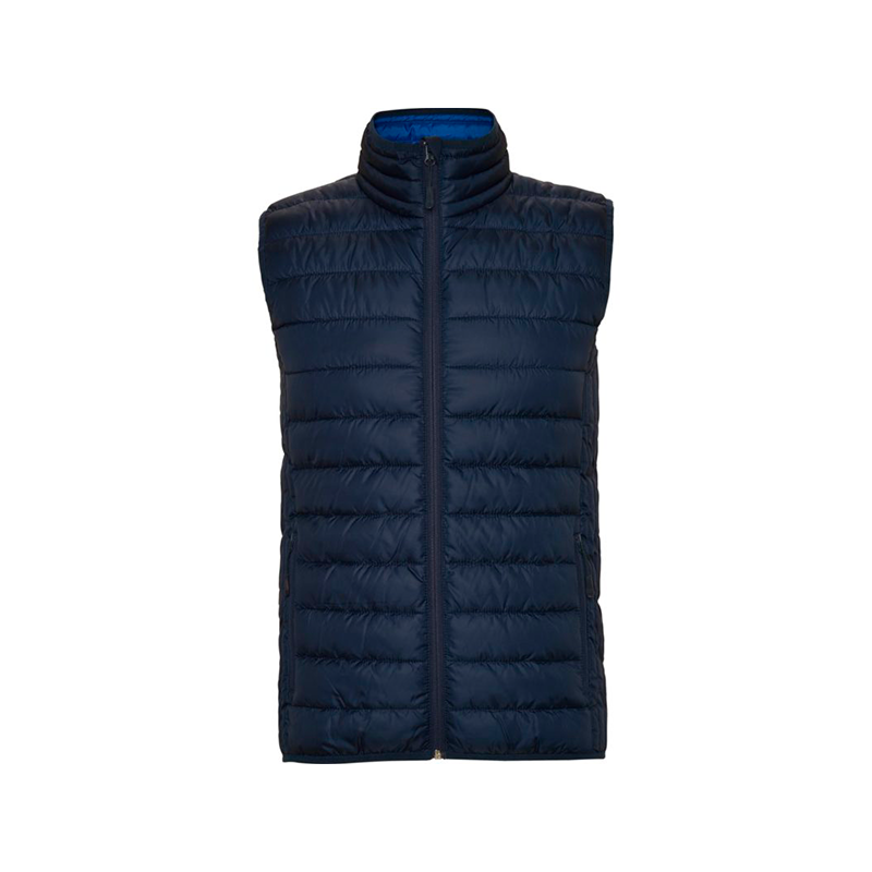 Chaleco acolchado resistente al agua. Cremallera frontal invertida al tono con protector de barbilla del mismo tejido. Bolsillos laterales con cremalleras invertidas al tono insertado en los paneles laterales. Vivo elástico al tono en sisas y bajo. Opción de colores lisos o a contraste en interior.