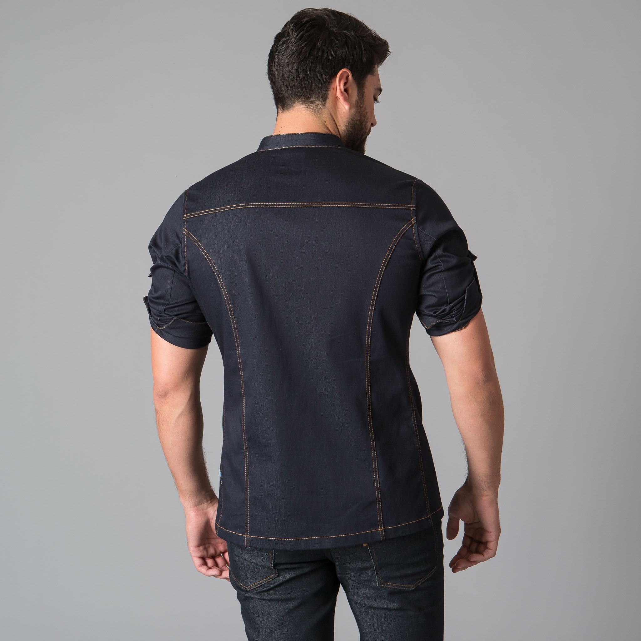 - Chaqueta para hombre en manga larga tipo roll up con corchete, con cuello tirilla, puños vueltos, un bolsillo en el pecho izquierdo y cierre central mediante botones de presión ocultos, el primero de ellos visto. Modelo semi ajustado, con costadillos en delantero y espalda. Confeccionada en TEJANO ELÁSTICO SIN LAVAR. Ideal para uniforme de camareros, cocineros y chefs en hostelería, restauración y cocina en general o para comercio. Disponible en modelo para mujer referencia 948100.