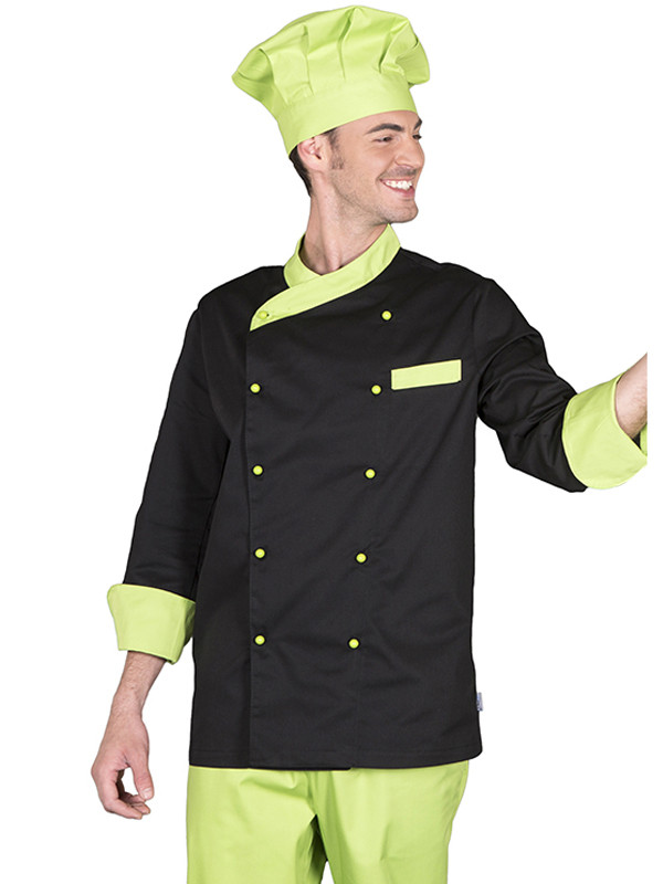 - Chaqueta unisex en manga larga, con puños vueltos, cierre cruzado mediante botones de chupete y un bolsillo en pecho izquierdo. Modelo holgado, con costadillos en espalda. Confeccionada en SARGA color negro con botones, cuello, vueltas de puños y vivo del bolsillo en pistacho. Ideal para cocineros y chefs en hostelería, restauración y cocina en general. Botones incluidos.