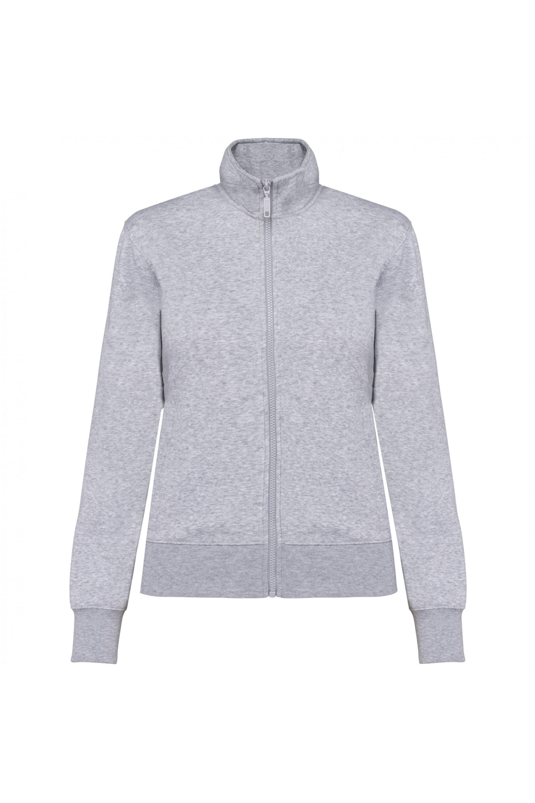 80% algodón/ 20% poliéster. 300 gramos. Tratamiento LSF (Low Shrinkage Fleece). Felpa perchada con 3 hilos de algodón peinado. Corte entallado. Mangas rectas. Cuello alto. Cierre con cremallera de plástico a tono. 2 bolsillos con cremallera y ribetes en laterales. Acabado de media luna en la parte interior-posterior del cuello para facilitar la personalización de marca. Acabado de canalé 1×1 en puños y el bajo de la prenda.