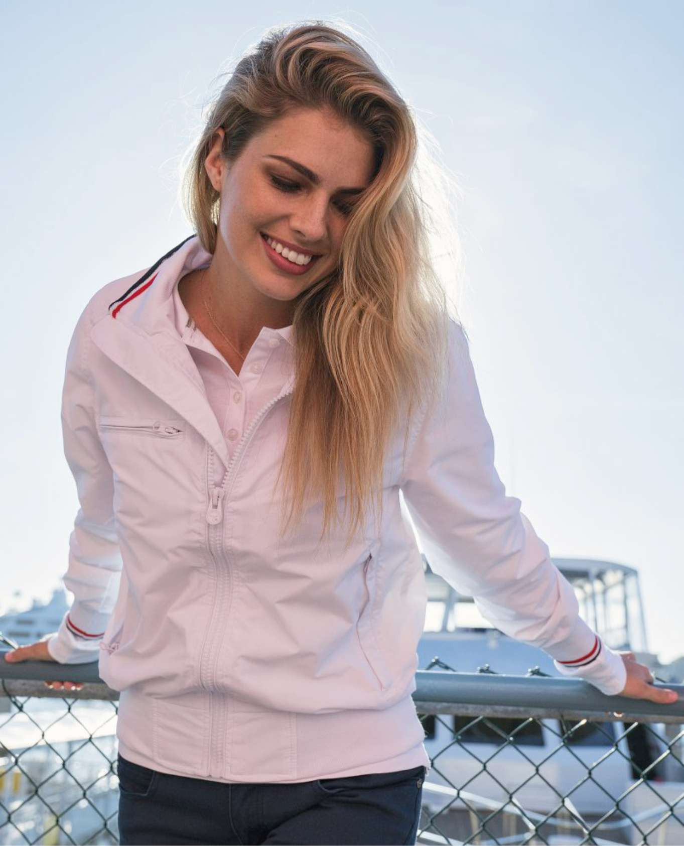 Chaqueta de nylon para mujer con detalle en mangas y cuello.