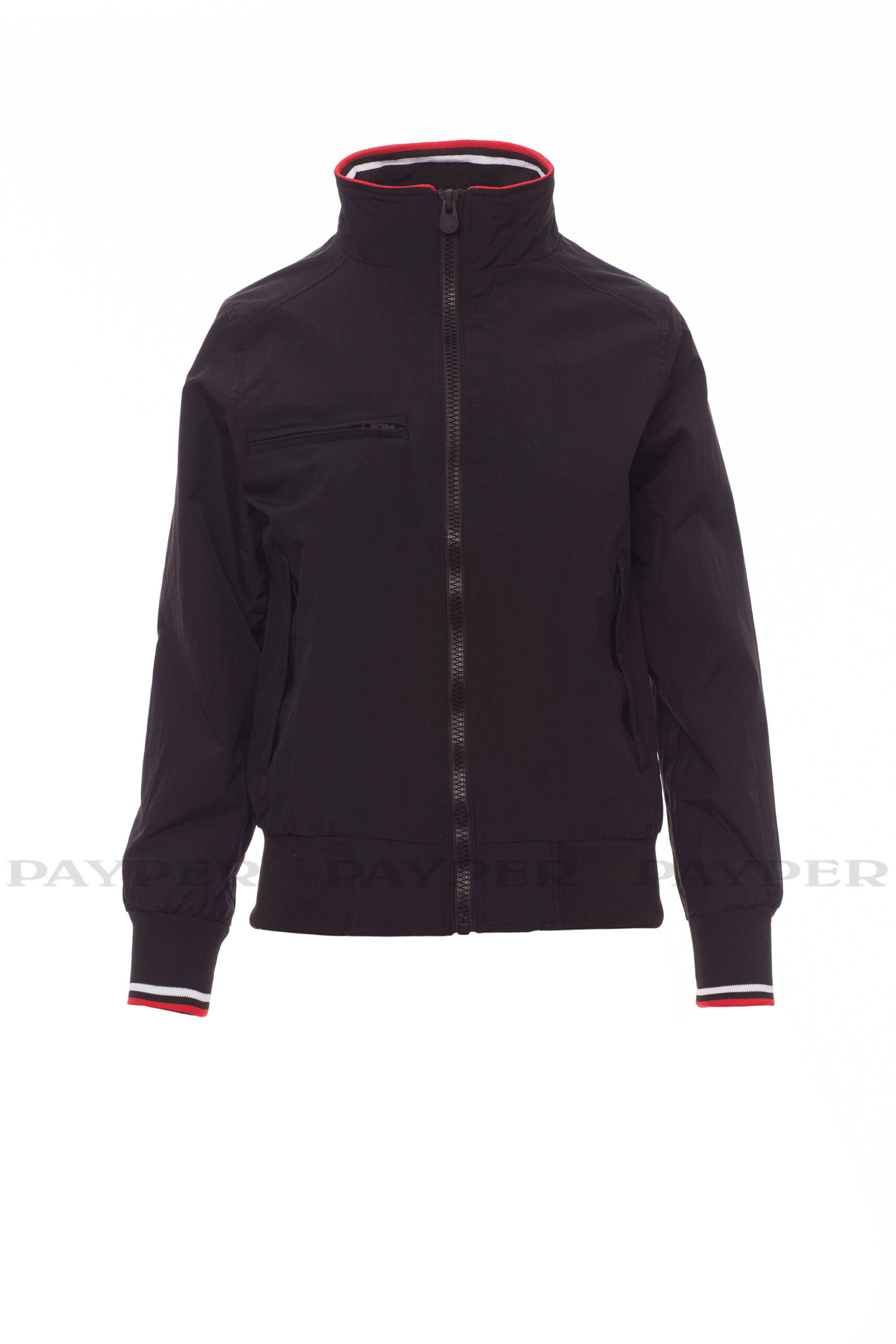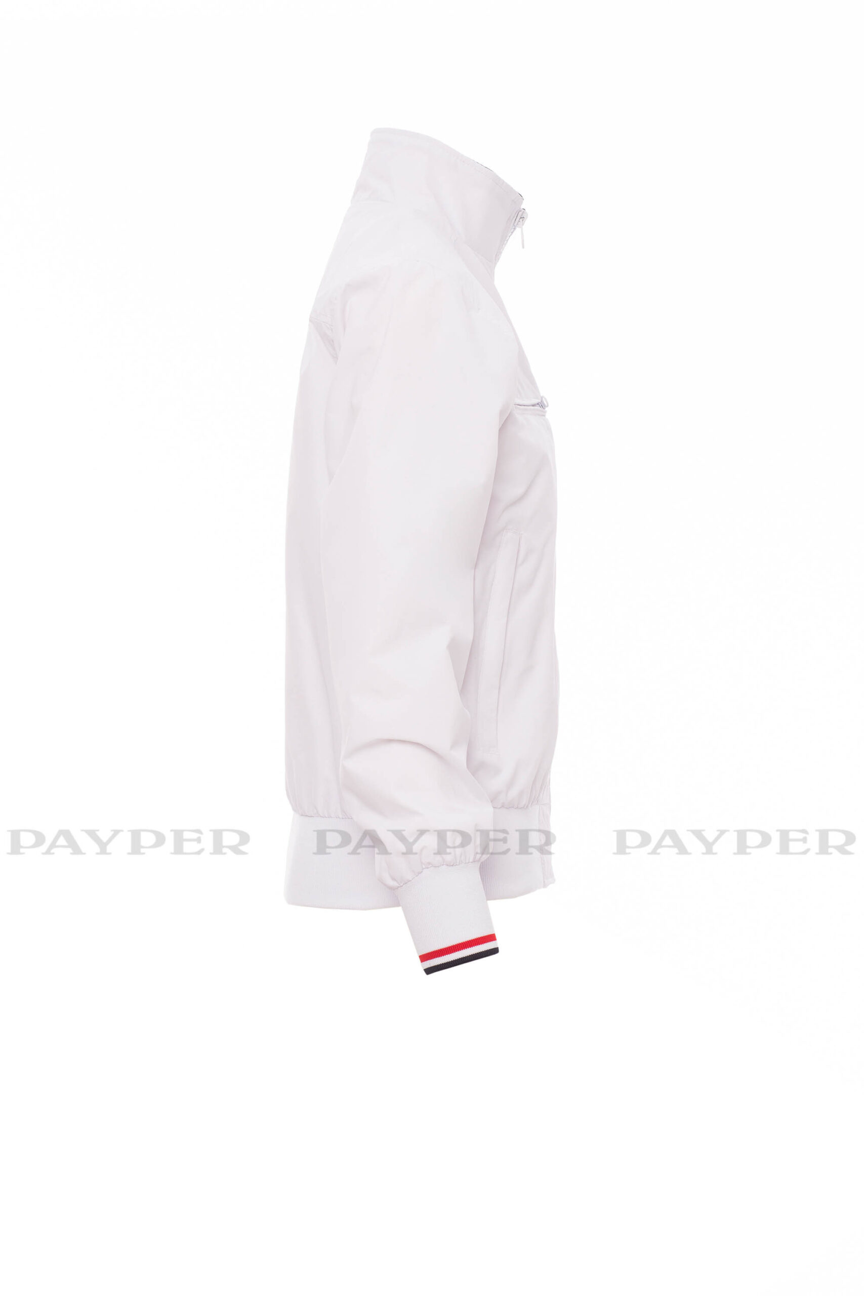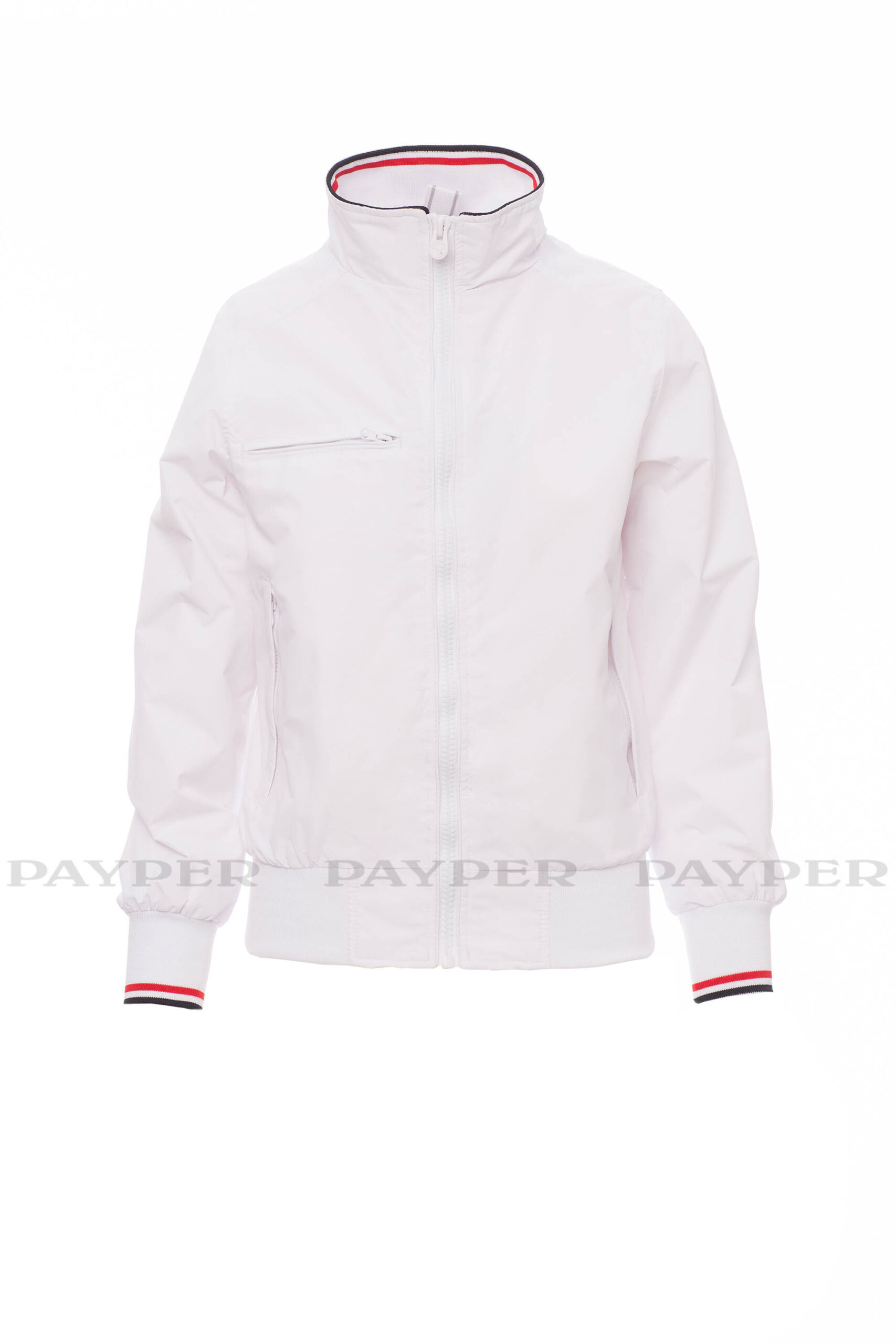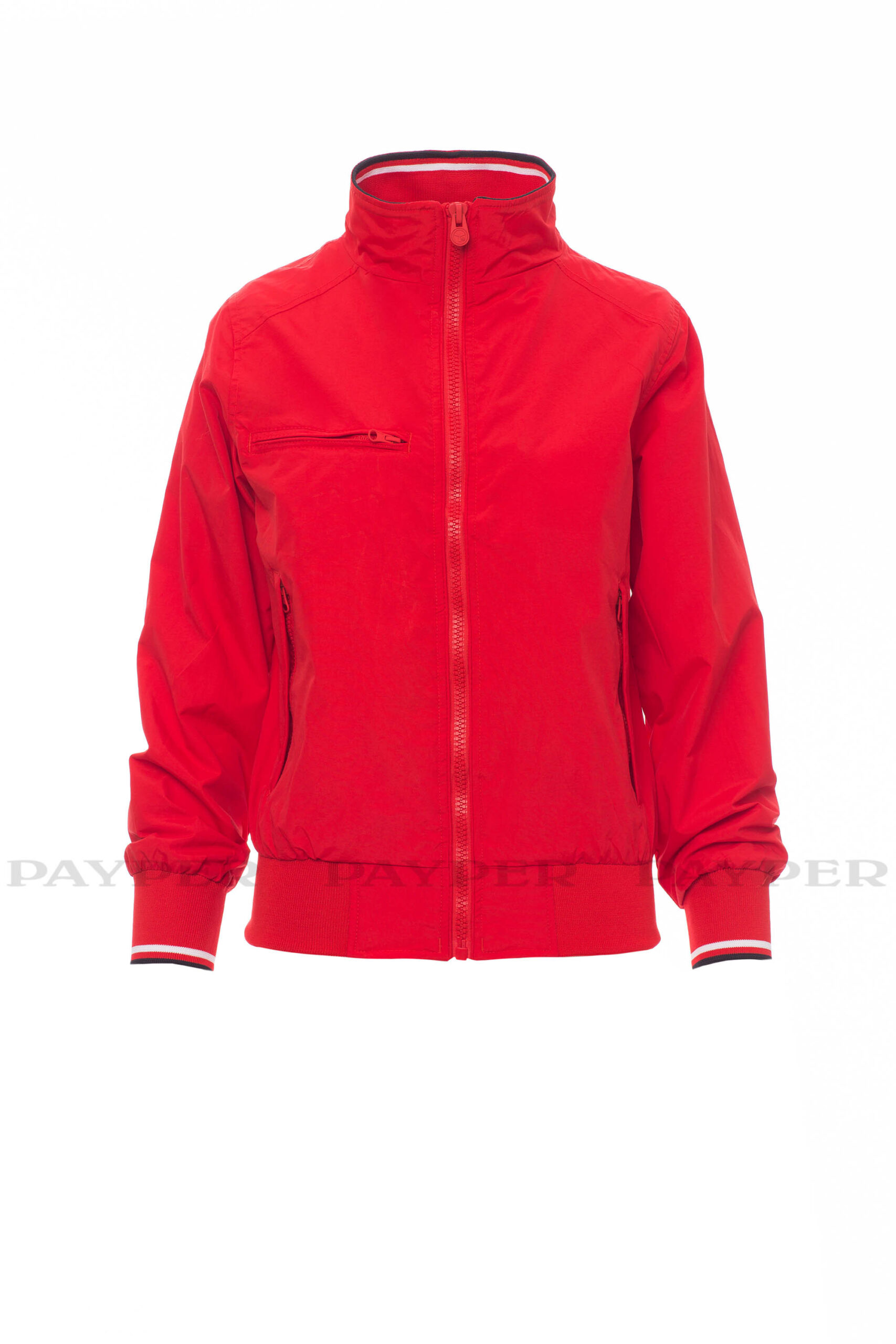 puños y cintura en tejido RIB elástico de rayas, dos bolsillos exteriores con cremallera de plástico.