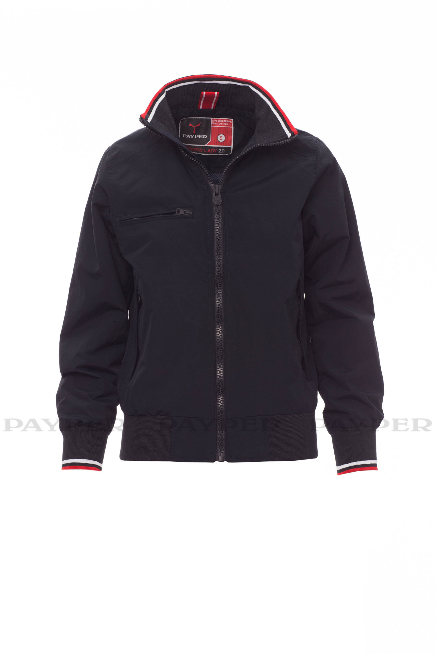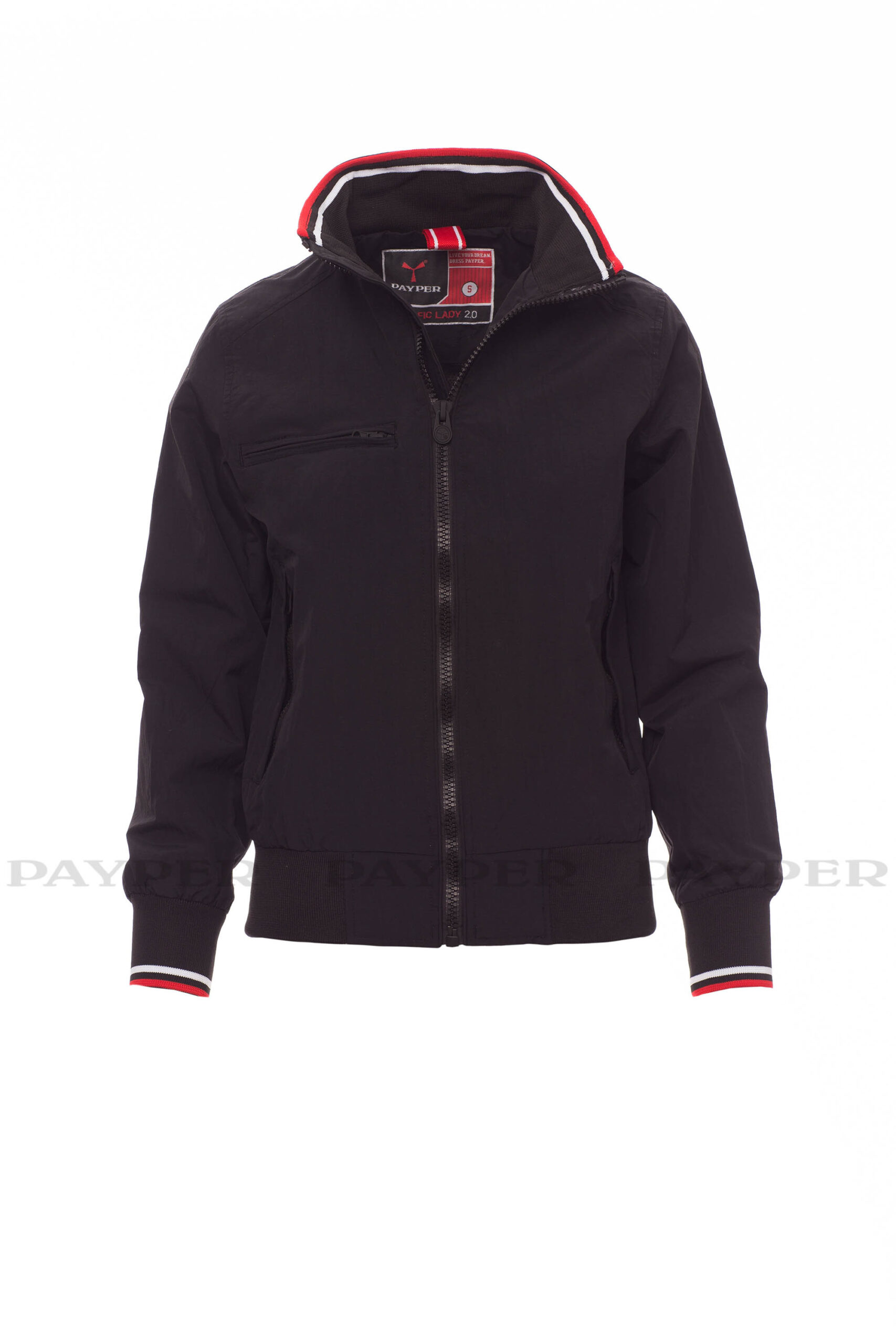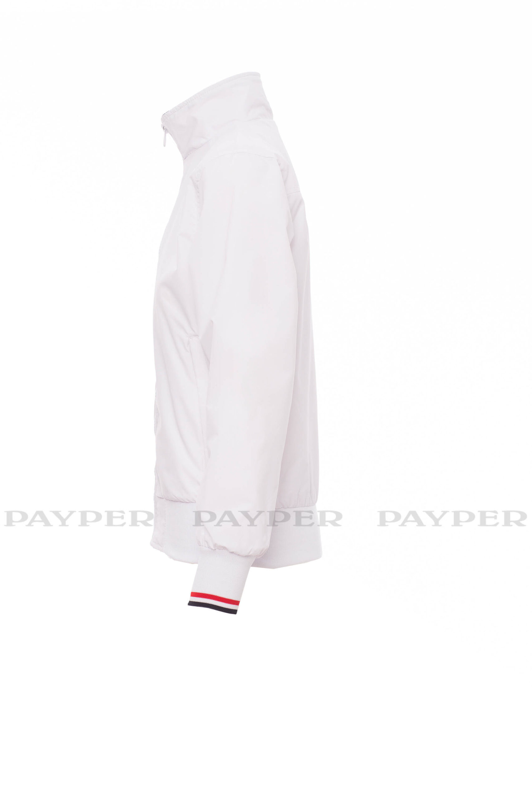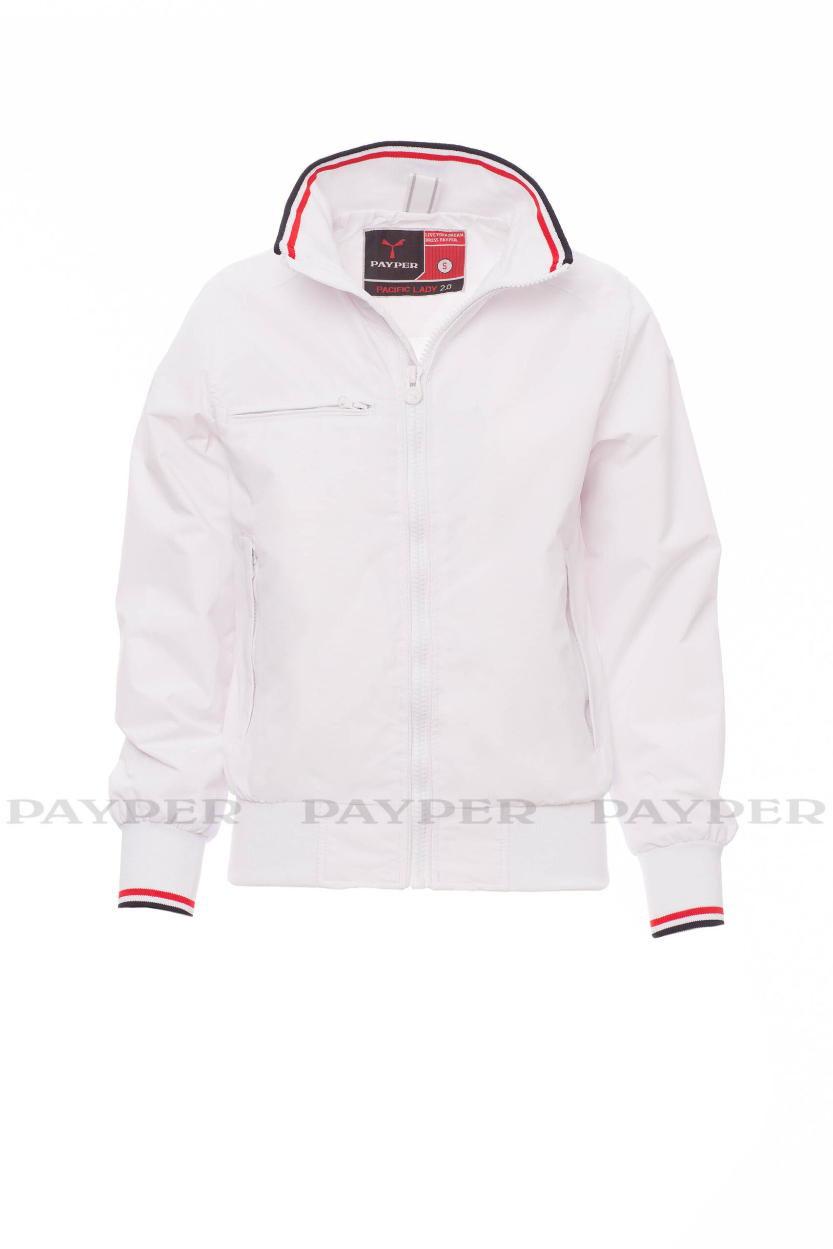 puños y cintura en tejido RIB elástico de rayas, dos bolsillos exteriores con cremallera de plástico.