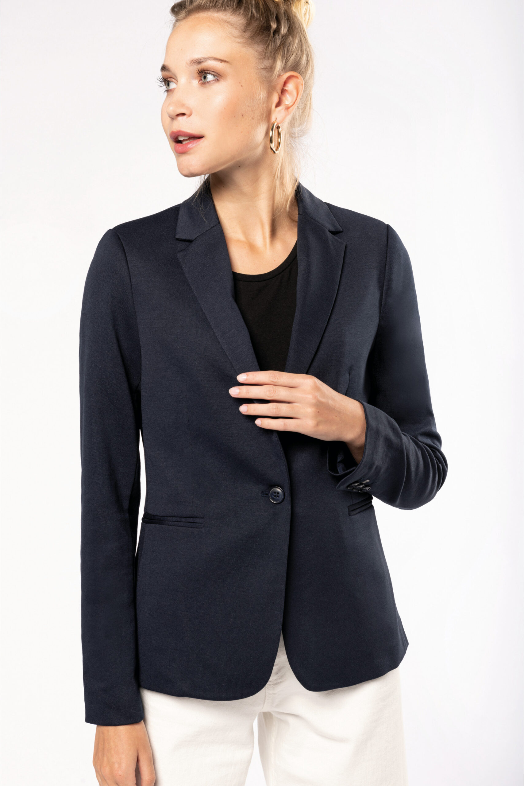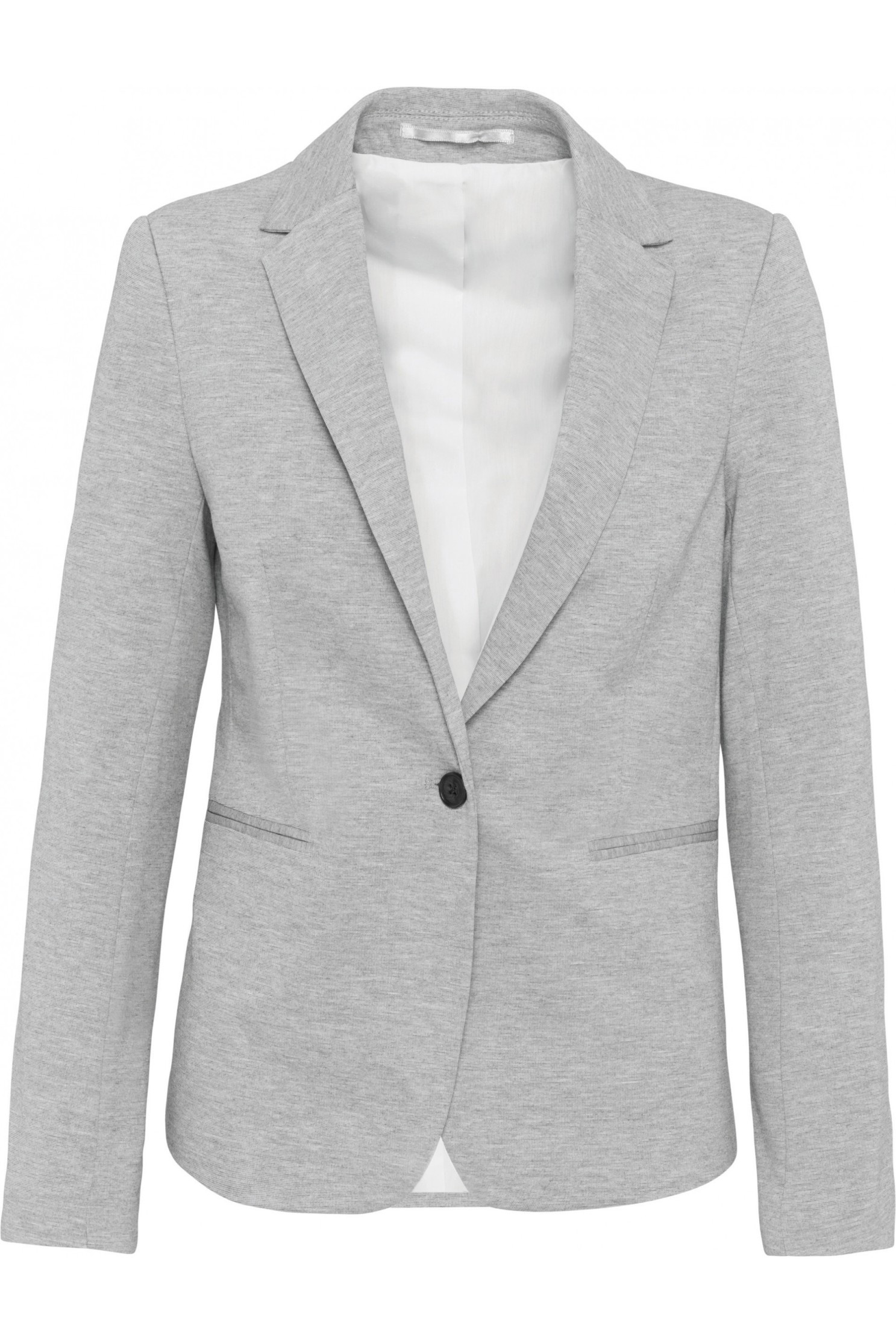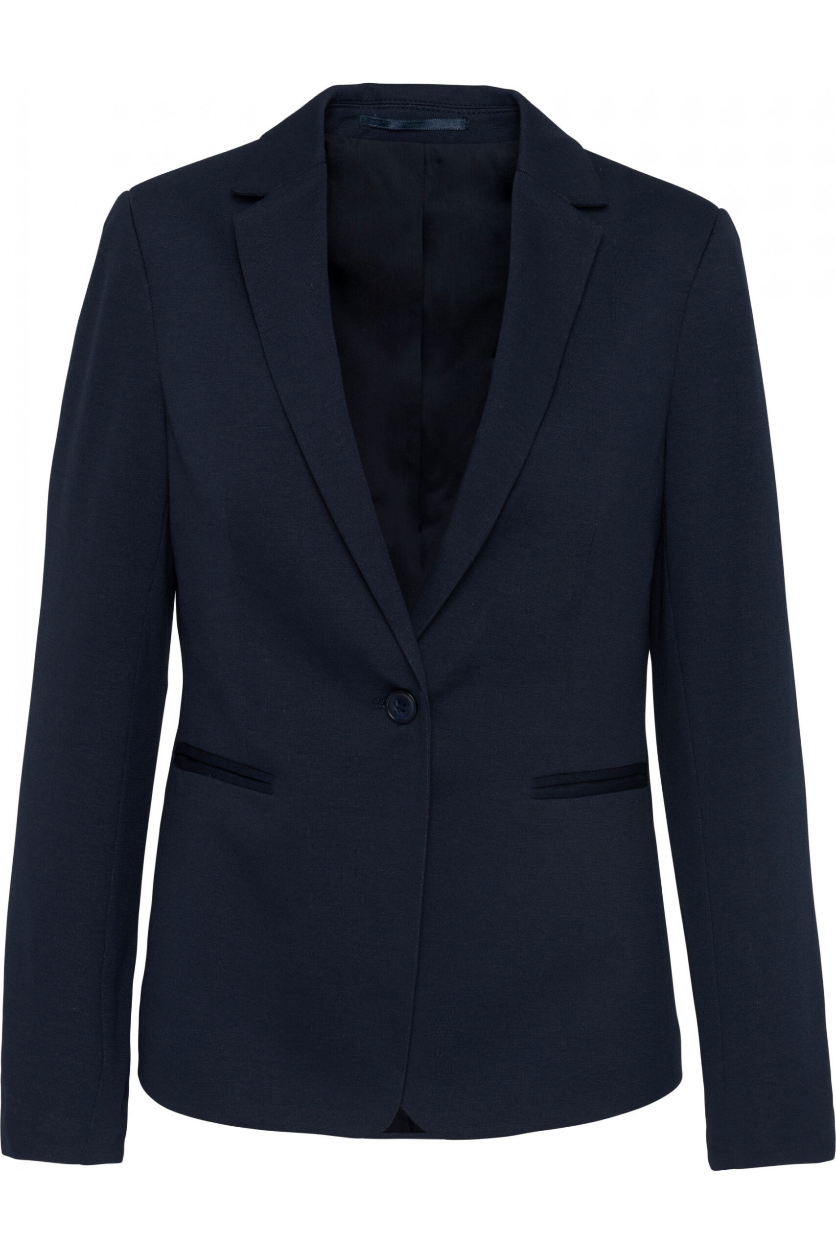 - 80% poliéster / 18% algodón / 2% elastán (Night navy heather) – 74% poliéster / 24% viscosa / 2% elastán (Light grey heather). Punto interlock. Forro del cuerpo de polialgodón y de mangas en tafetán de poliéster. Chaqueta con 1 botón. 2 bolsillos con ribetes en la parte delantera. 1 bolsillo interior con botones. Ribete interior delantero contrastado. Bajo de mangas con 3 botones, 1 de los cuales con un ojal contrastado. 1 abertura en la parte trasera para mayor confort. 1 cremallera invisible en el interior del lado izquierdo para la personalización.