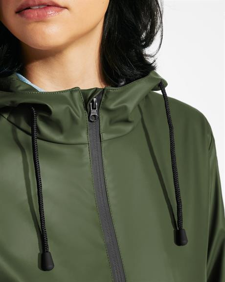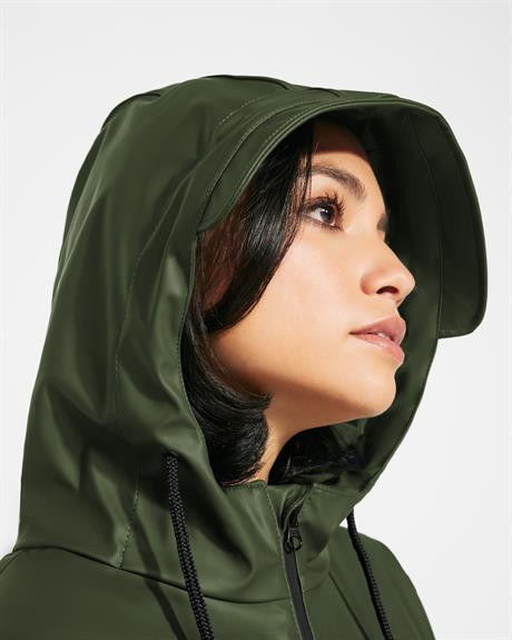 Chubasquero impermeable con capucha fija y visera. Ligeramente ajustado en la cintura. Cremallera frontal de doble dirección. Bolsillos laterales y costuras termoselladas. Cordón ajustable en capucha. Apertura trasera. Acceso interior para reprocesos.