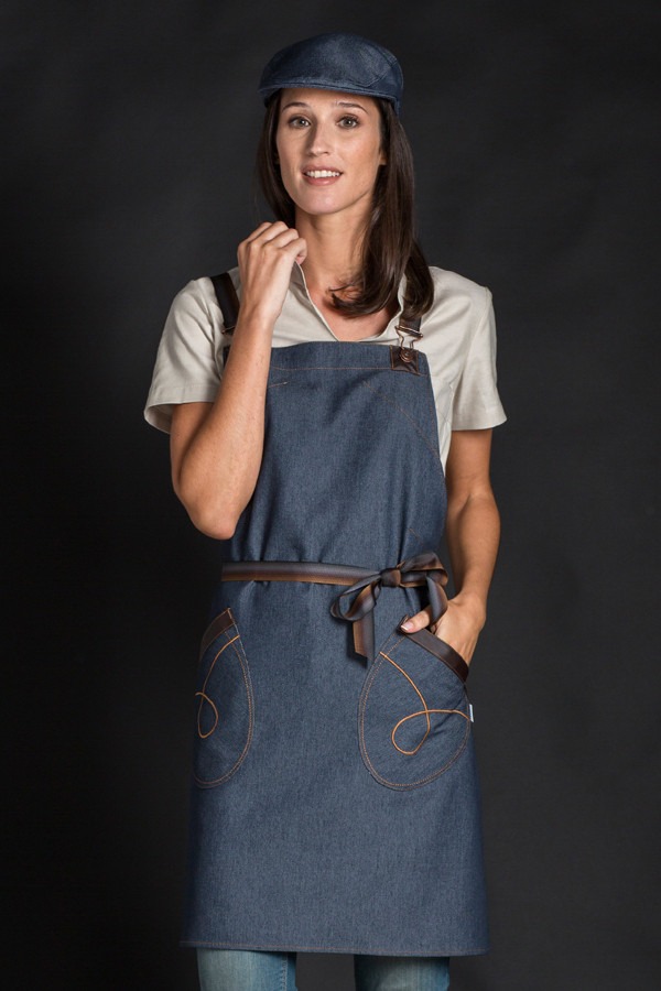 Delantal con peto en tejido vaquero elástico con cintas en polipiel.