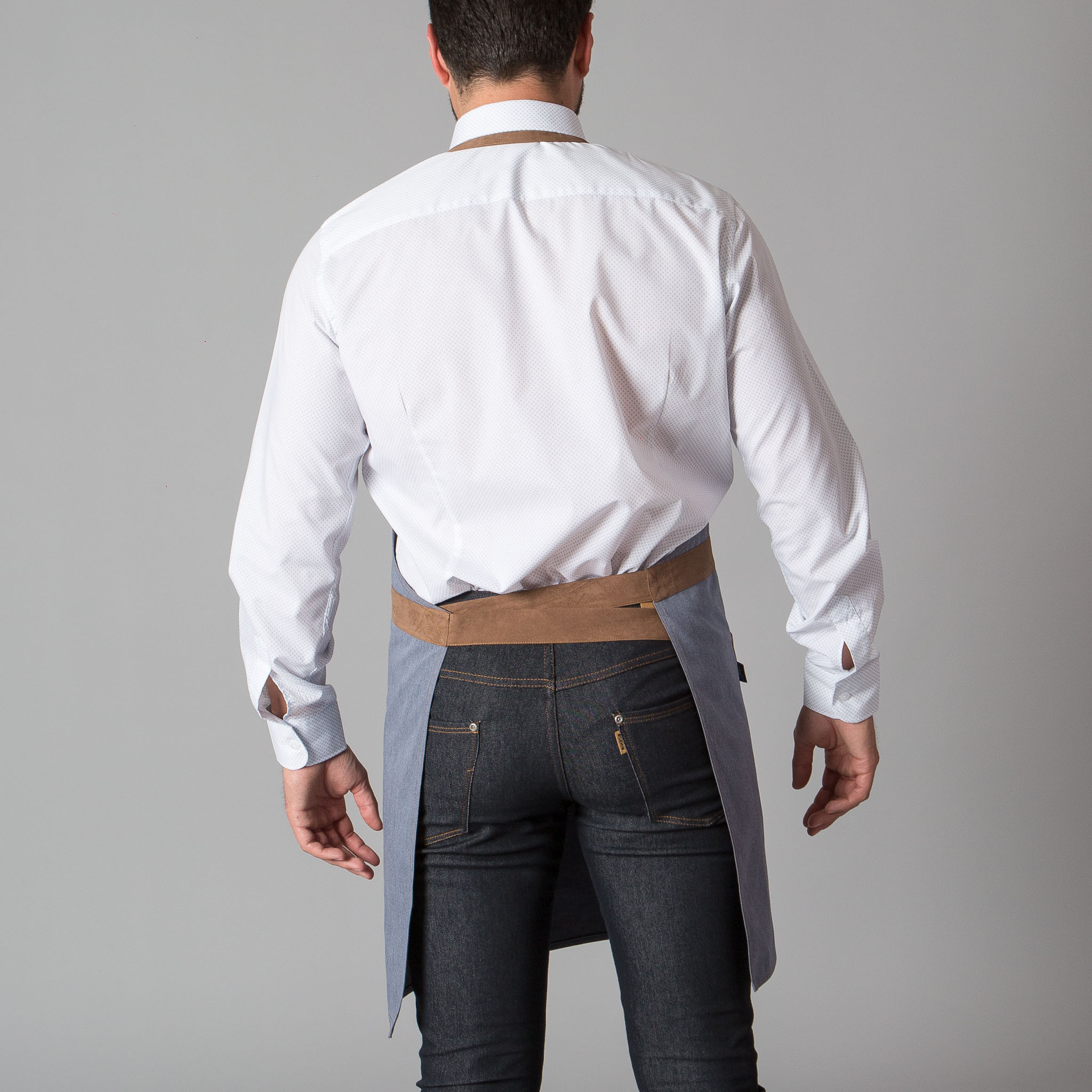 - Delantal de peto con dos bolsillos. Cintas de anudar, tira del cuello, un bolsillo y vuelta del otro bolsillo en antelina marrón. El cierre de la tira del cuello va mediante botón y ojal regulable. Ideal para uniformes de bares, restaurantes, cafeterías, barberías y comercios en general.