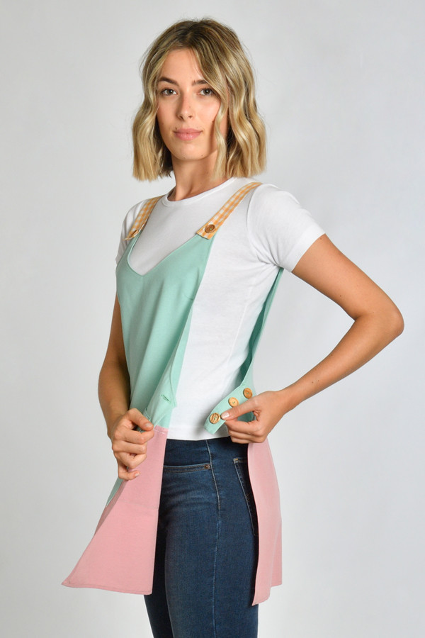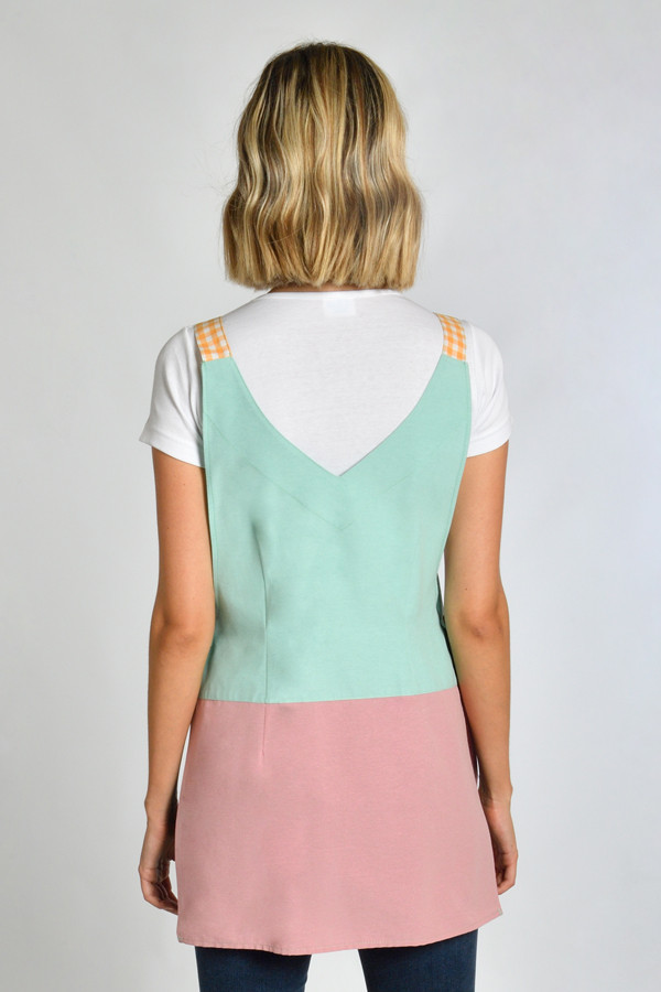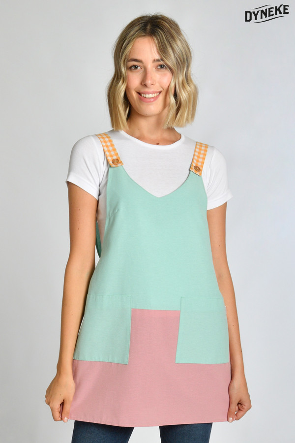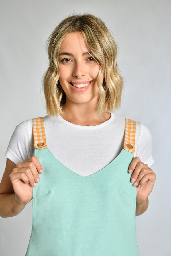 Detalle de tirantes en tejido de cuadros y botón efecto madera.