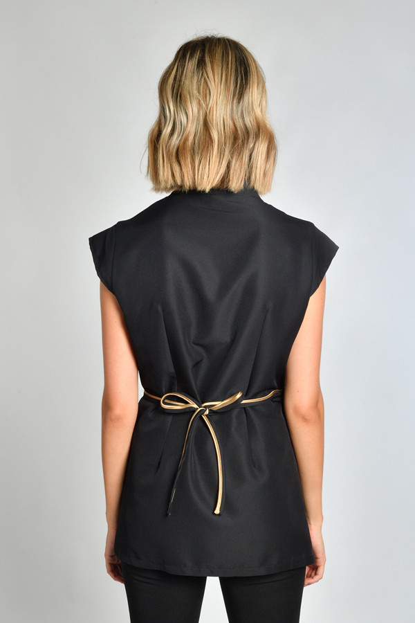 Estola para spa y estética en microfibra con vivo dorado. Estilo kimono cruzado se ajusta con cintas atrás. Muy elegante con vivo raso dorado en línea de cuello, cintas y bolsillos. Dos amplios bolsillos. Talla: ÚNICA. Largo: 77 cm. Tejido suave, ligero , de secado rápido.
