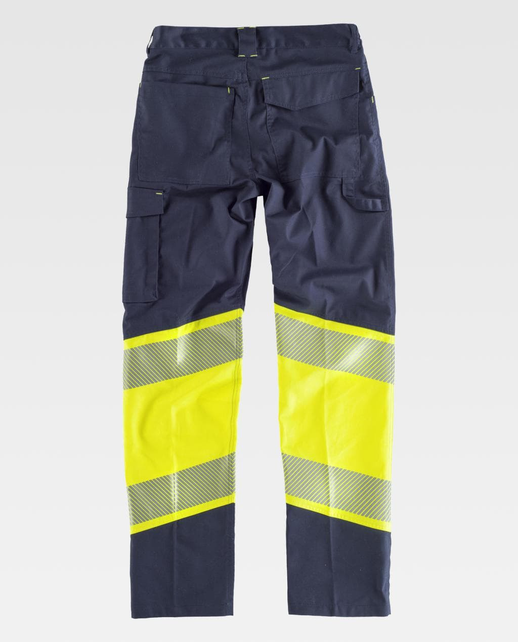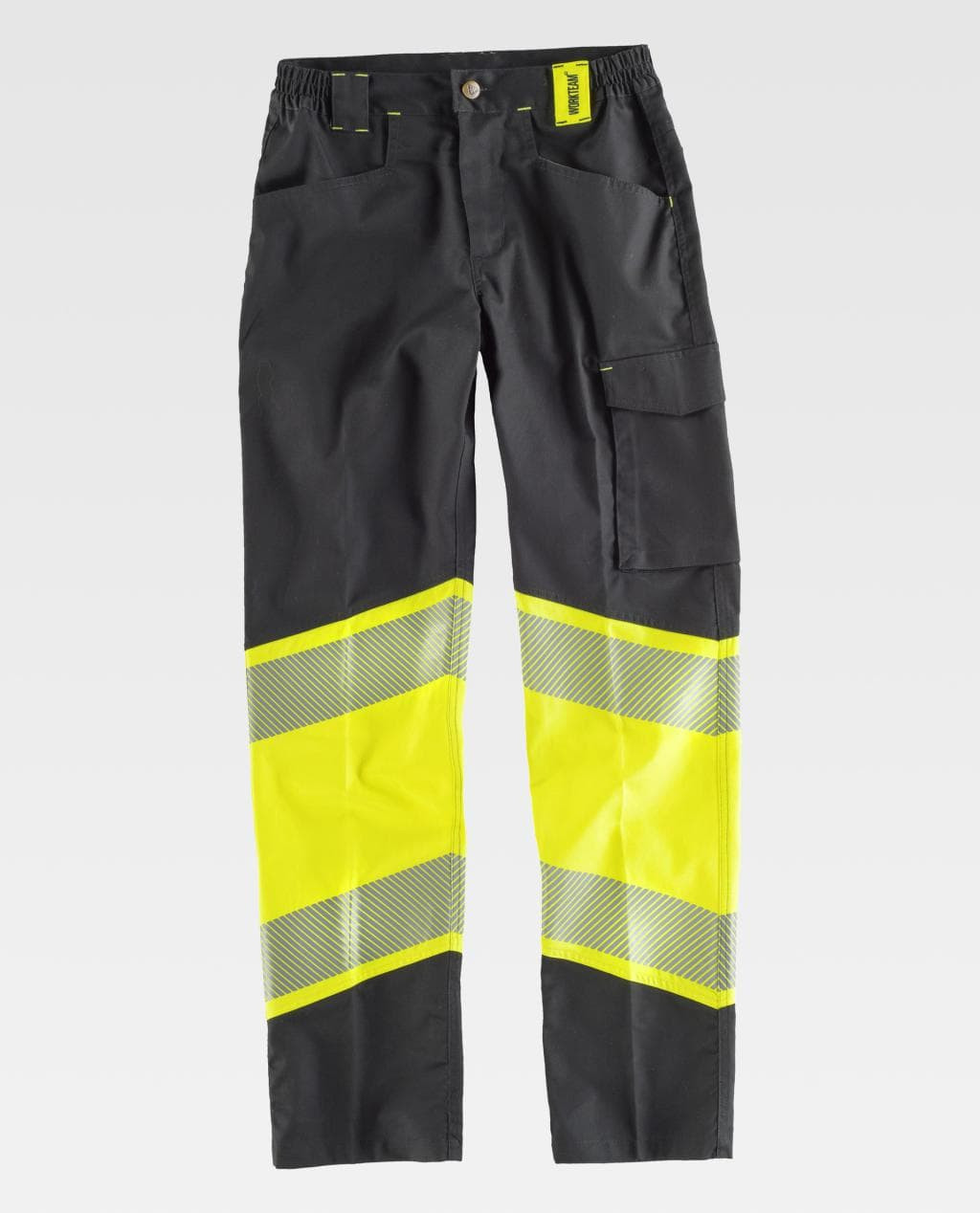 Pantalón elástico multibolsillos, combinado con alta visibilidad. Cintas discontinuas.
