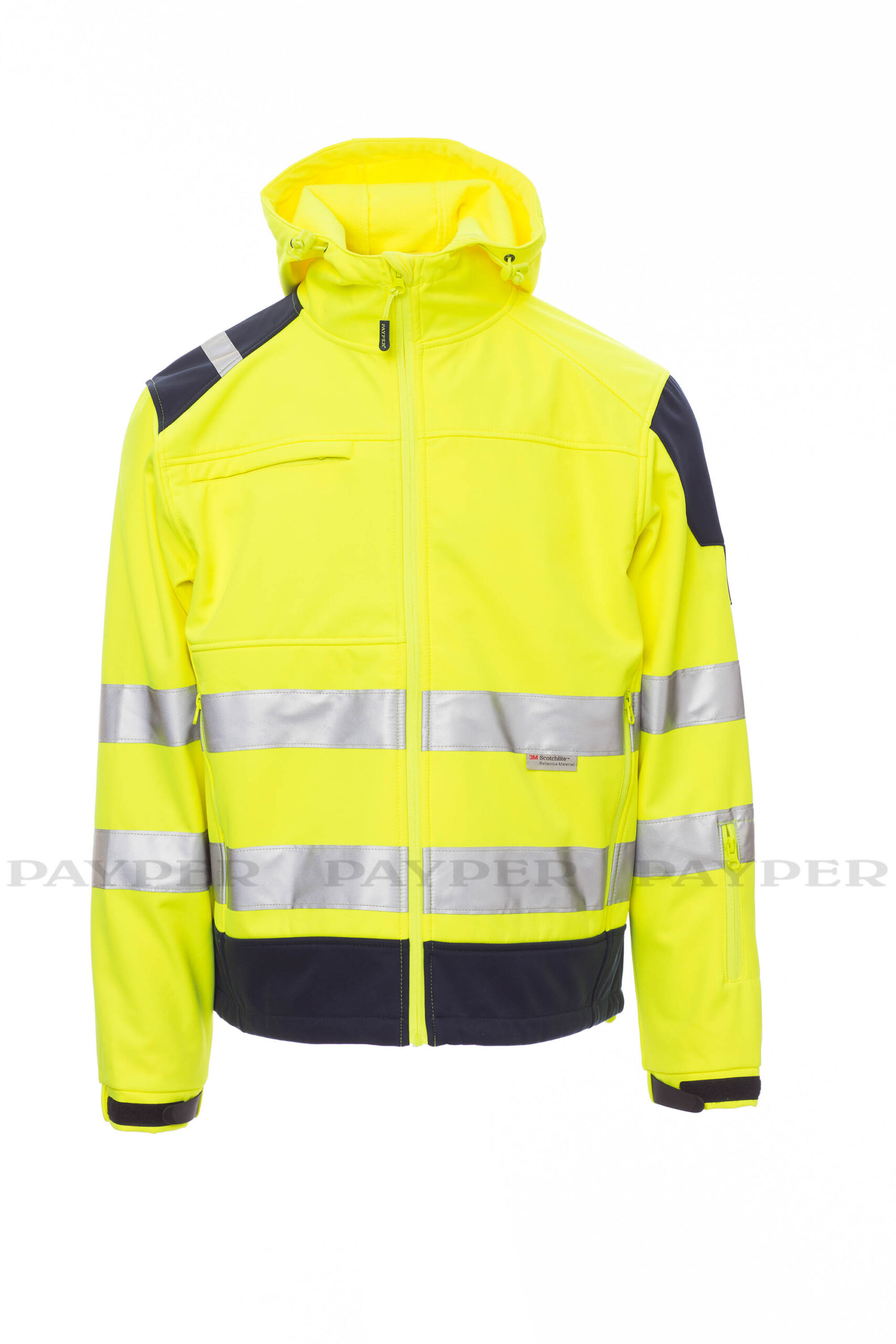 Chaqueta entallada de alta visibilidad y dos tonalidades para hombre con bandas 3M, mangas ranglán, capucha con doble costura y codón, cremallera SBS larga con cinta, puños ajustables con cierre de velcro, dos bolsillos laterales con cremallera, un bolsillo a la altura del pecho y un bolsillo en el brazo izquierdo.