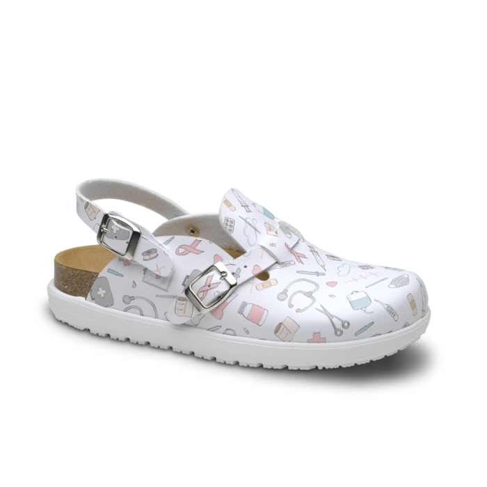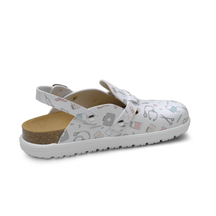 Zueco sanitario anatómico y antideslizante fabricado en material reciclado.